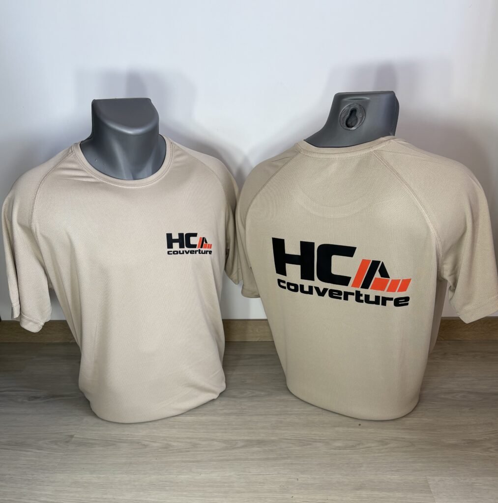 Nous avons accompagné HC Couverture avec la réalisation de t-shirts personnalisés à leur image et la fourniture de shorts de travail adaptés à leurs besoins de chantier.